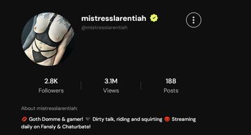 Hello, I'm Mistress Larentiah. Goth Domme and gamer streaming almost everyday! Cum play with me!Mostrar más